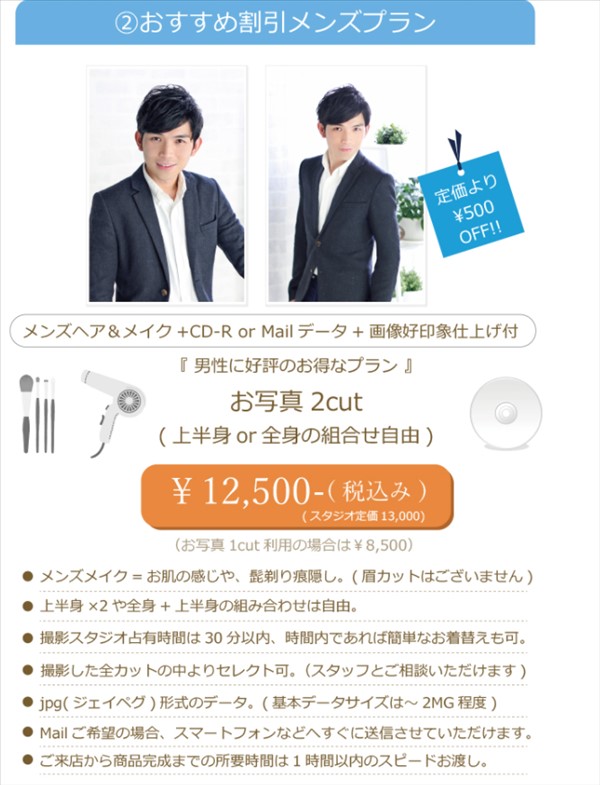おすすめ割引メンズプランは12,500円(税込み)。メンズのヘアメイクが付いていて、写真はデータで受け取ることができます。画像好印象仕上げもあるので写真を撮るのが苦手な人でも大丈夫。男性に好評のお得なプランです。定価よりも500円引き。