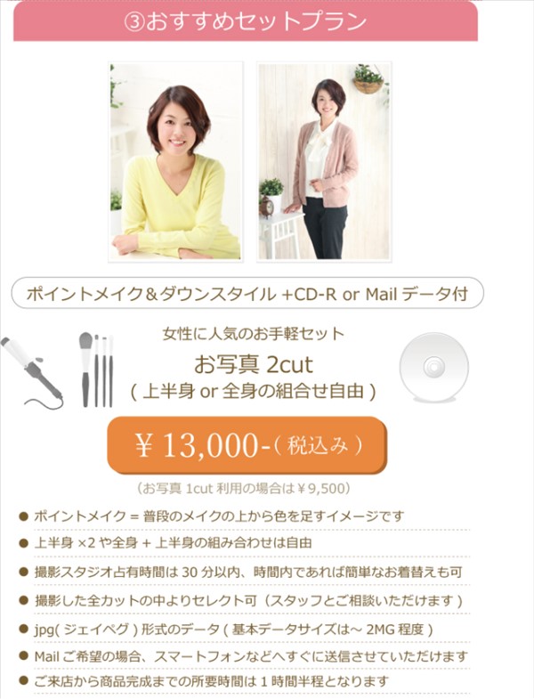 女性向けのおすすめセットプランはポイントメイク、ダウンスタイルのヘアメイクが付いて13,000円(税込み)です。もちろん写真はデータでもらうことができます。