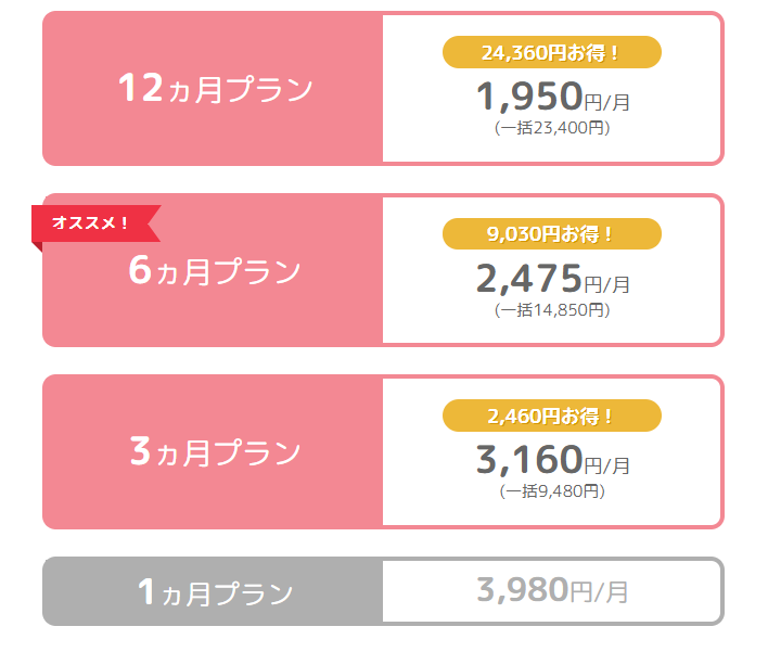 6ヵ月プランだと2月額,475円となり、9,030円もお得になります。