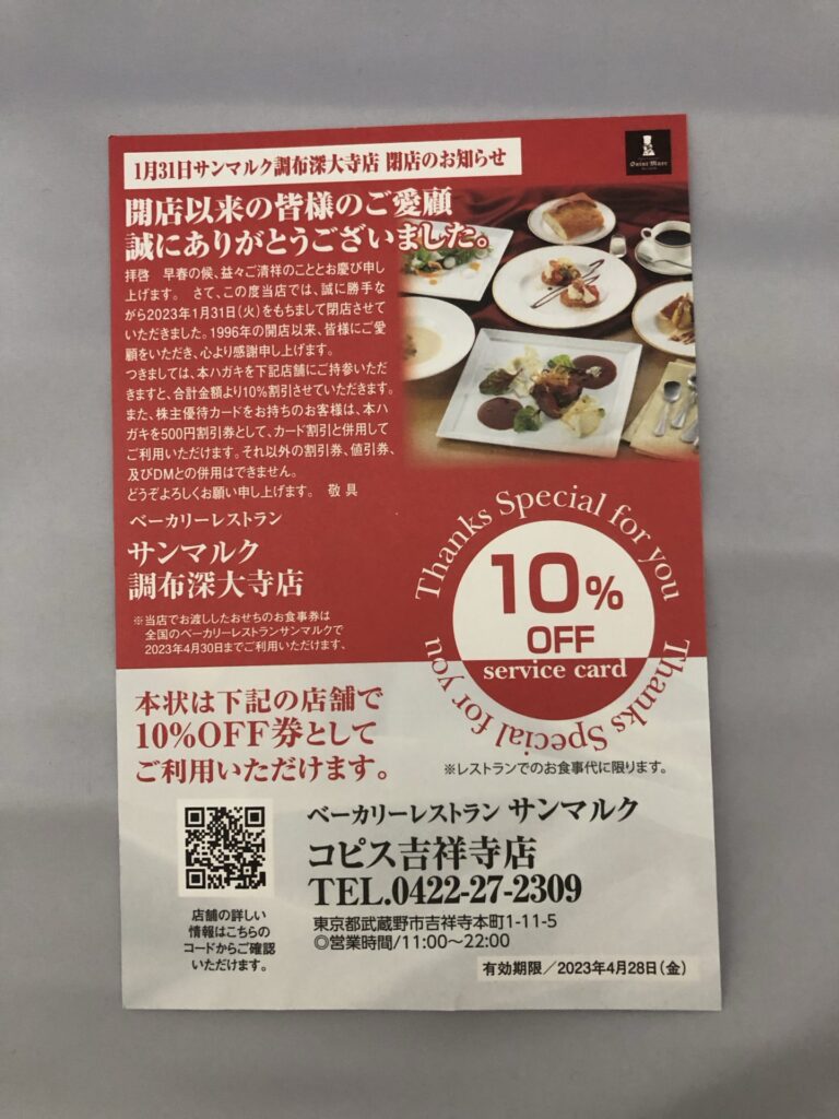 サンマルク調布深大寺店の閉店にともなってハガキが送られてきました。店内でアンケートを書かれたお客さん宛てですね。