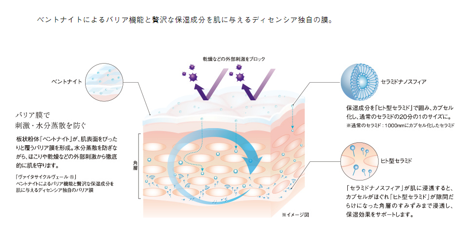 ディセンシアのすべてのクリームに採用されていて、肌表面をぴったりと覆うバリア膜を作り上げて、刺激から角層を守るとともに、潤いがすみずみまで浸透するようにしているそうです。
