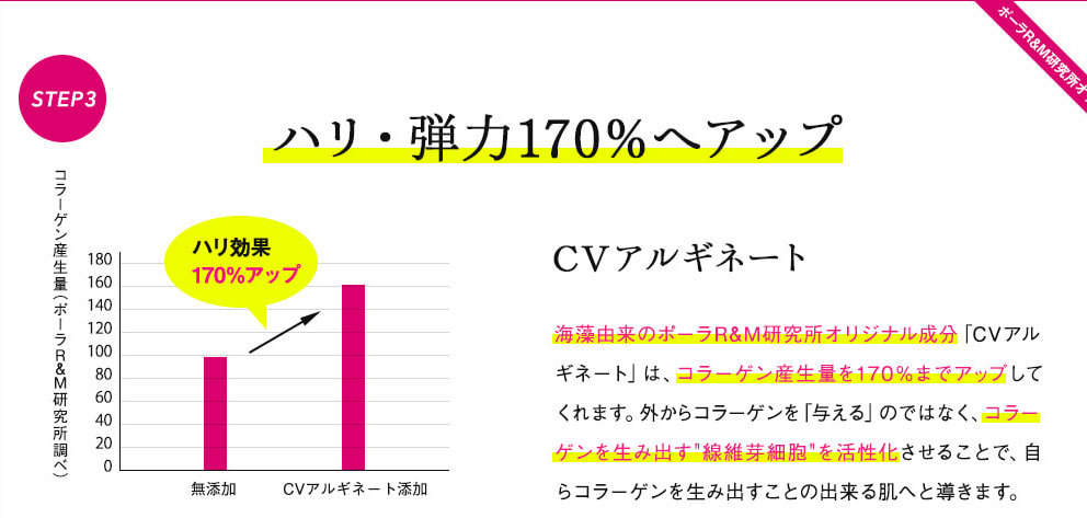 CVアルギネートという海藻由来の成分でコラーゲン生産量を170%までアップしてくれます。