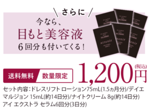ローション、デイエマルジョン、ナイトクリームの他に、今だけ目もと美容液が6回分もついているのでさらにお得です。