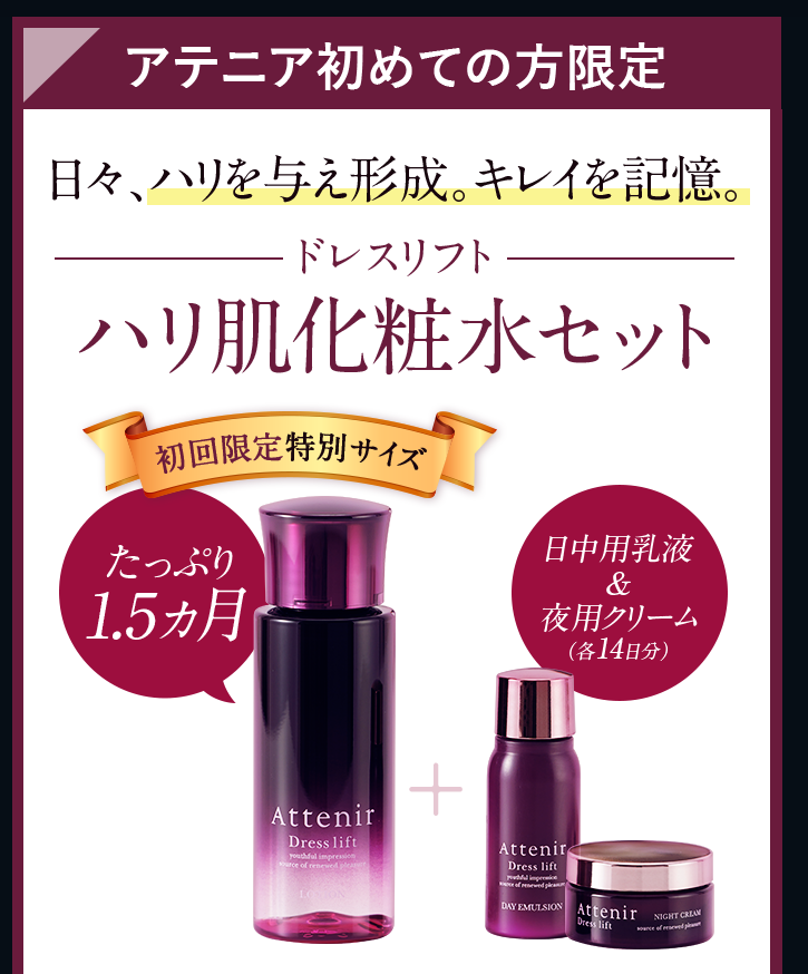 まずはドレスリフトハリ肌化粧水セットをお試しください。そして2週間後のハリ肌を実感してみてください!