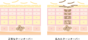 肌のターンオーバーのリズムが崩れていると古い角質がスムーズに皮膚からはがれ落ちなくなるので、毛穴がふさがりやすくなり大人ニキビの発症にもつながります。