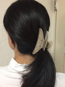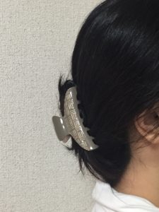 次に私がチャレンジしたのがまとめ髪。髪をまとめて、クリップで髪全体をおおうように留めます。