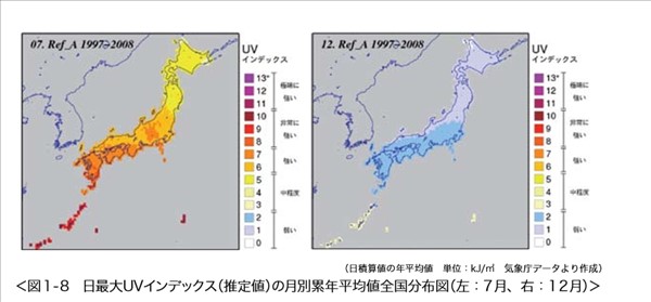 例えば7月と12月の日本列島に降りそそぐ紫外線の量についてこちらの図を見るといいでしょう。