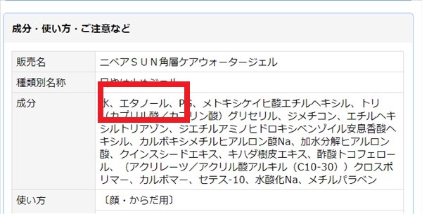 例えばニベアサン ウォータージェル SPF35 [ボトル]の成分を見ると、このようにエタノールが入っているのでアルコールフリーの商品ではありません。