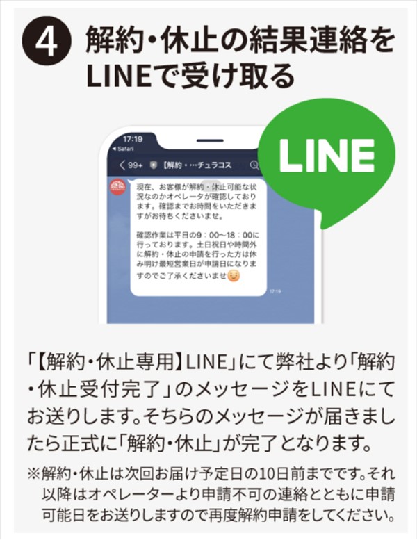 定期コースの解約のやり方はまずは電話をして、LINEで解約ができるそうです。