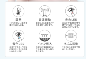 温熱、音波振動、赤色LED、青色LED、イオン導入、リズム振動