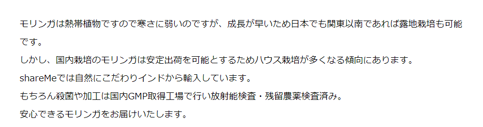 インドから直輸入した新鮮なモリンガが使われていて、認定を受けている国内のGMP工場で作られています。