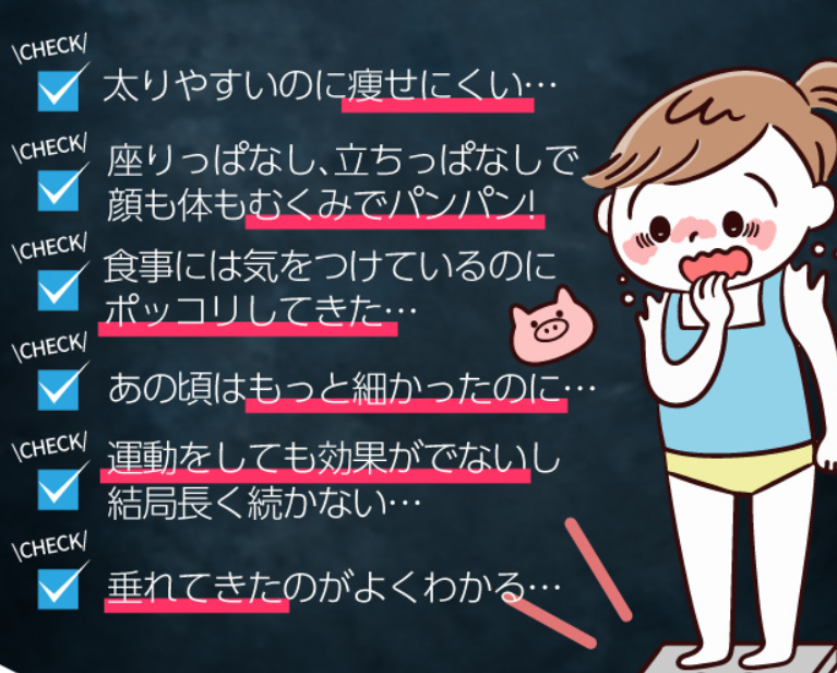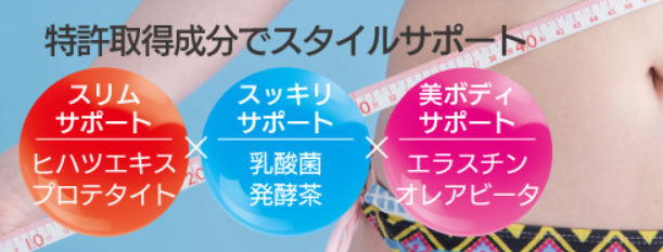 スリムサポート・すっきりサポート・美ボディサポートをしてくれる成分が配合されていて、基礎代謝の低下して体系が崩れやすくなったからだをサプリの力で美ボディへと導いてくれます。