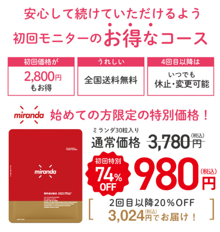 ミランダのは公式販売ページで買うと、通常価格3,780円が2,800円引きになり、980円で購入できます。