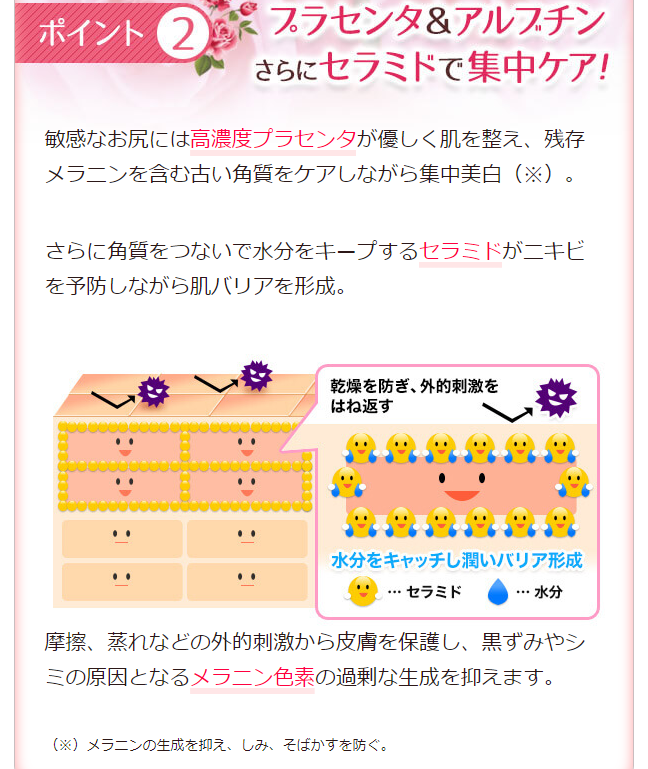 ②プラセンタで古い角質をケアしながら集中美白効果&セラミドで肌の水分をキープしながらニキビ予防。