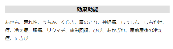 あせも、荒れ性、うちみ、くじき、肩のこり、神経痛、しっしん、しもやけ、痔、冷え症、腰痛、リウマチ、疲労回復、ひび、あかぎれ、産前産後の冷え症、にきびに!