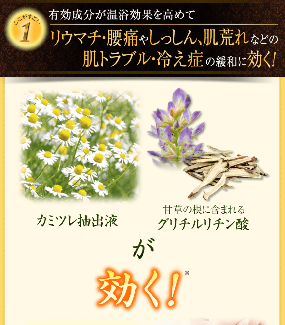 温浴効果を高めて、リウマチや腰痛・しっしん、冷え性、あかぎれなどの緩和に効きます。