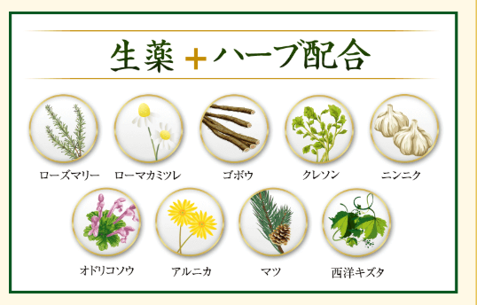 9種類の生薬を配合しました。ローズマリー、カミツレ、ゴボウ、クレソン、にんにく、オドリコソウ、アルニカ、マツ、西洋キヅタの9種類の生薬が配合され冷え性やあかぎれに効果があります。