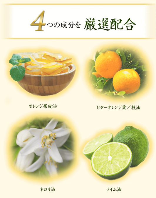 。オレンジ香皮油、ビターオレンジの葉、ネロリ油、ライム油が配合されています。