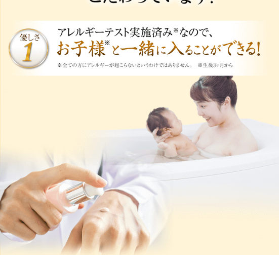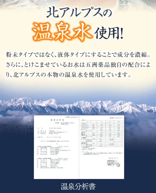 粉末タイプではなく液体タイプであることで肌触りをよくしました。北アルプスの温泉水を使用しており、滑らかな肌触わりになります。