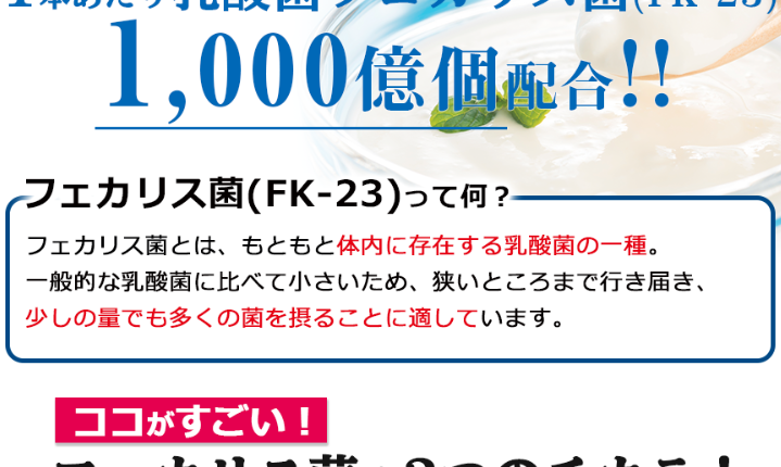 また、乳酸菌フェカリス菌を1/5のナノサイズまで小さくすることで大量に配合することが可能になりました。1本あたり1000億個含まれています。