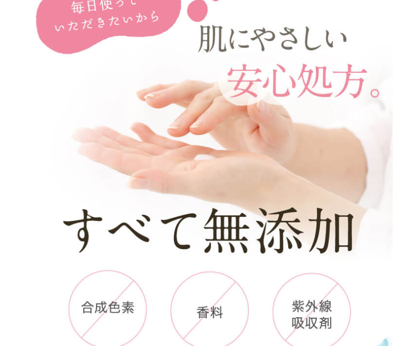 肌に優しい安心処方で合成色素、香料、紫外線吸収剤はすべて無添加です。
