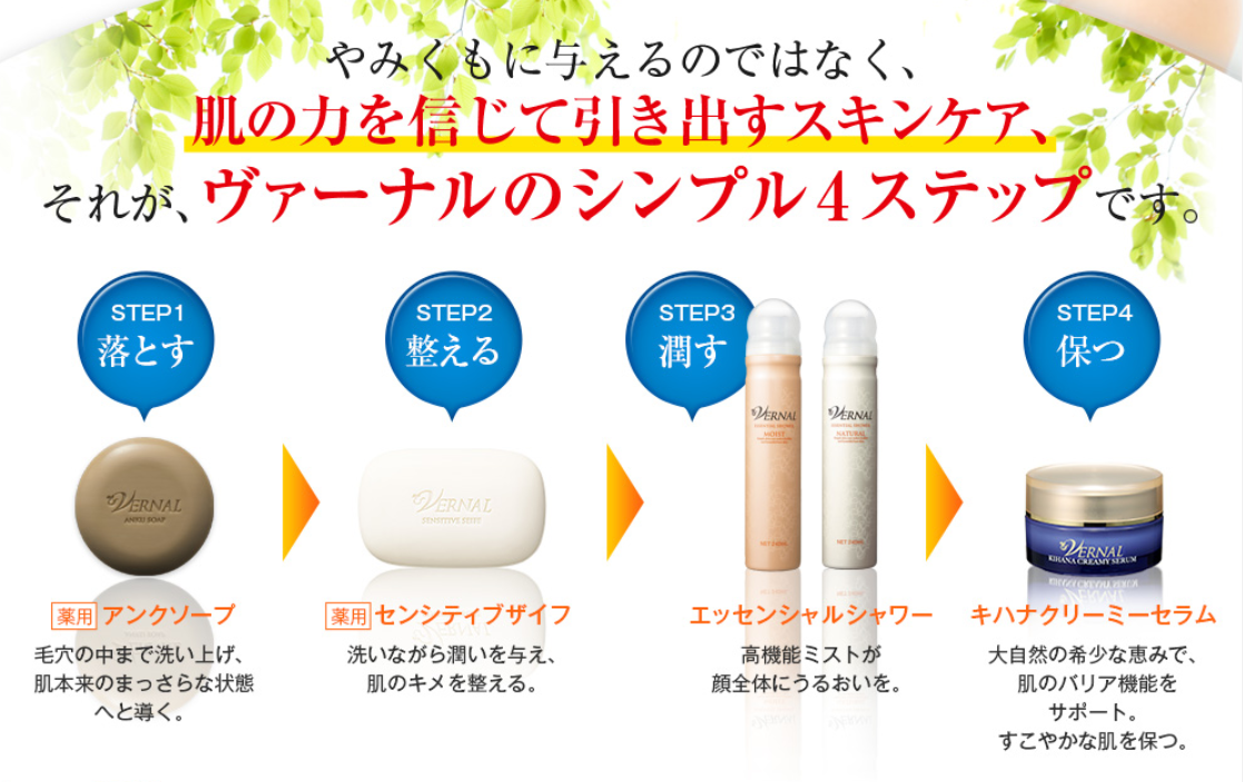 VERNALのモチハダ洗顔セットならシンプルスキンケアの4ステップのお手入れができます。