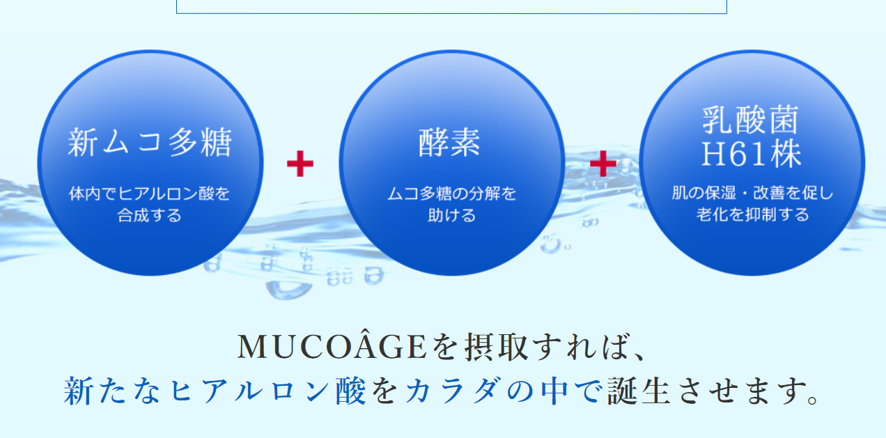 MUCOAGEは元々人間が本来持っているヒアルロン酸を作り出すための栄養素である栄養源、ムコ多糖を開発しそれをサプリメントに配合することで体内でヒアルロン酸を合成し増加させる働きがあります。