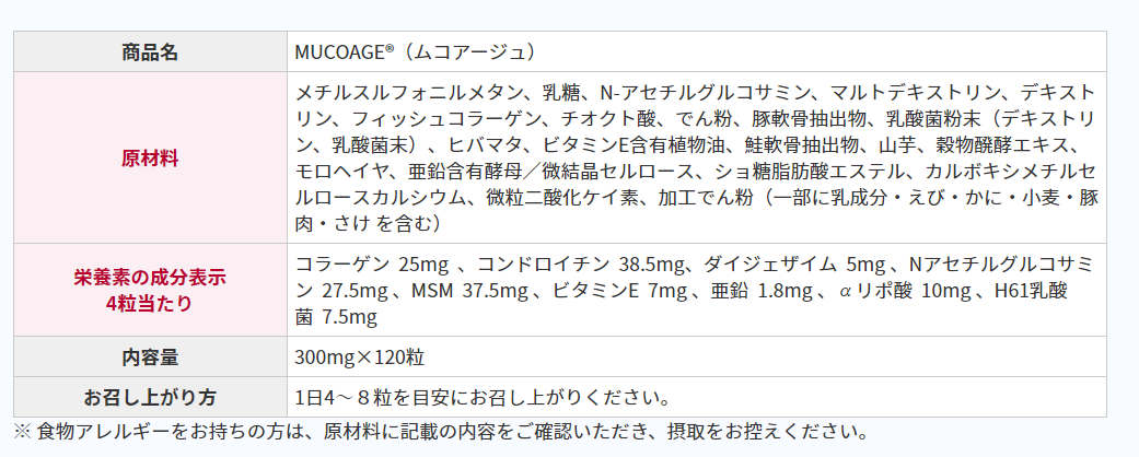 MUCOAGEの即効性ですが即効性はなくまた、食物アレルギーがある方の場合、アレルギー反応が出る恐れがありますので使用を中止してください。