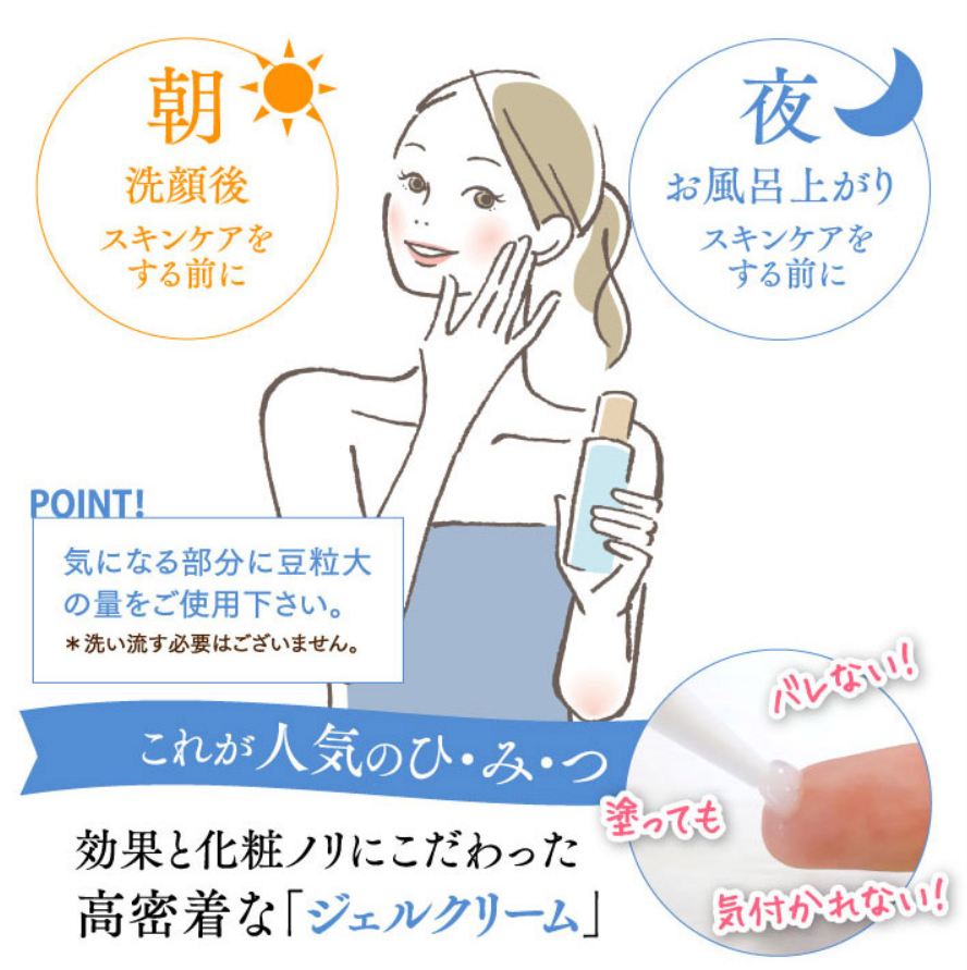 効果的な使い方のポイントは指の腹を使ってミラセレブを馴染ませることでジェルクリームが密着して特に乾燥や肌荒れなどが気になるところは重ね塗りをしたり、厚めに塗るのをおススメします。