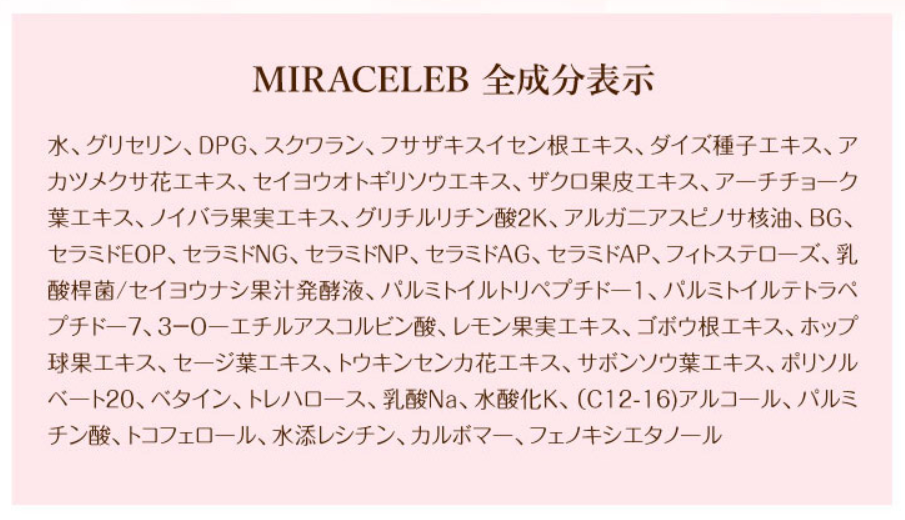 ミラセレブに使われてる成分として敏感な口元や口周りを整える効果が期待できる「レッドクローバー」「ザクロ果皮エキス」「ダイズ種子エキス」肌のバリア機能を高めたり、ツヤを引き出したり、肌に潤いを与えてくれる成分として「ビタミンC」「レモン果実エキス」「ゴボウ根エキス」「ホップ球果エキス」「グリチルリチン酸2K」「アルガンオイル」毛穴を整える成分として「バイオベネフィティ」「ノイバラ果実エキス」「セイヨウナシ果汁発酵エキス」肌のハリを守る成分として「ペプチド」保湿成分として、肌馴染みが良く成分が浸透しやすいラメラ構造を持った「セラミド」と希少なオイル「アルガンオイル」を含んでいます。