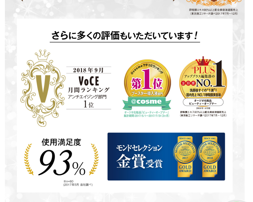 2018年9月にはVoceという雑誌の月間ランキングのアンチエイジング部門1位を獲得、アットコスメのブースター導入液部門第一位などを獲得している実力派です。